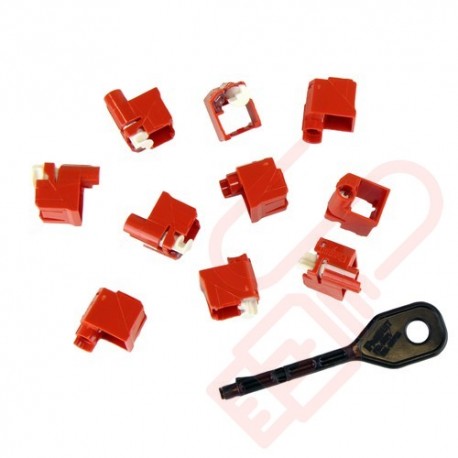 | Each pack consists of 10 Red RJ45 Lock-in Devices complete with a universal key. These locks provide physical security by securing patch leads in place in switchs or jack points, either Cat5e or Cat6. | |